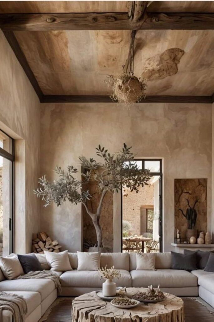 You can recreate this by mixing imperfect materials like plaster walls, natural wood, and soft fabrics.