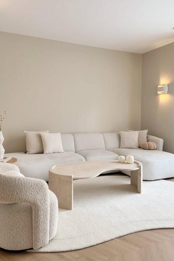 You can recreate this by choosing rounded furniture and keeping walls clean with subtle texture.