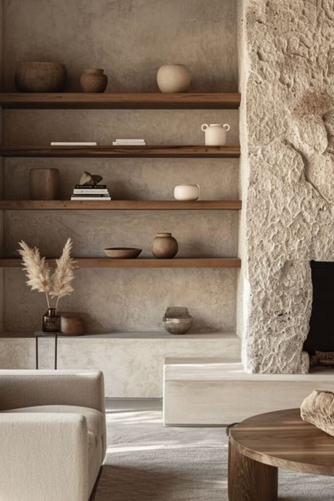 You see how a few ceramic pieces, books, and natural textures create balance.