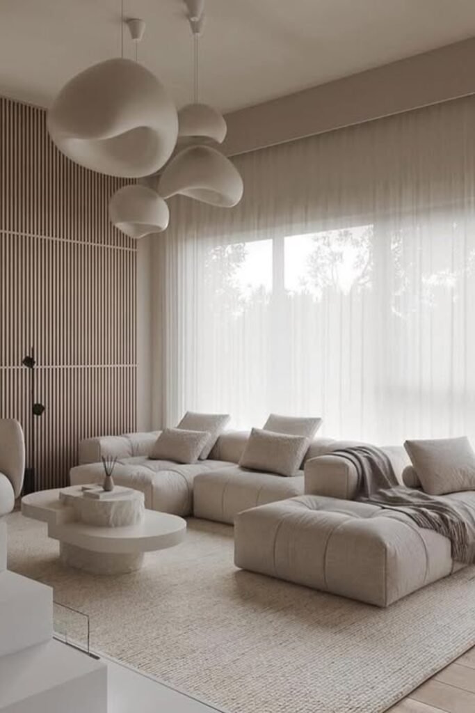 You can see how different shades of beige, sofa, rug, cushions, and curtains, create depth without adding clutter.