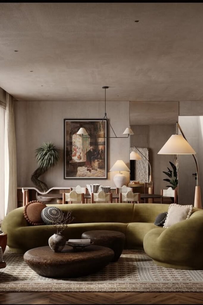 You see how the curved olive sofa becomes the focal point without breaking the calm vibe.