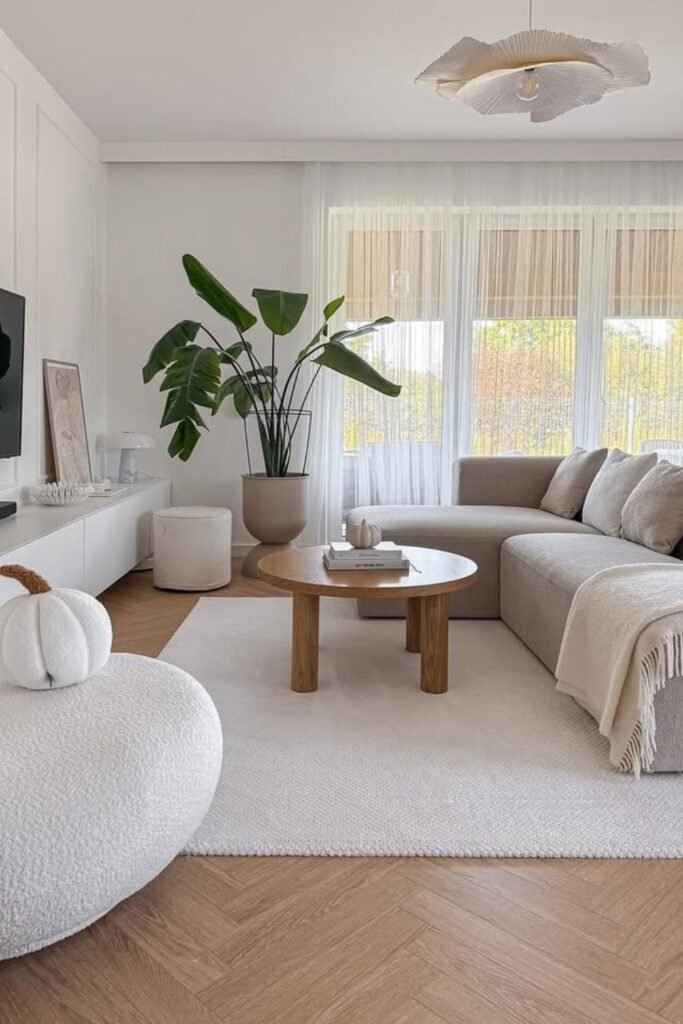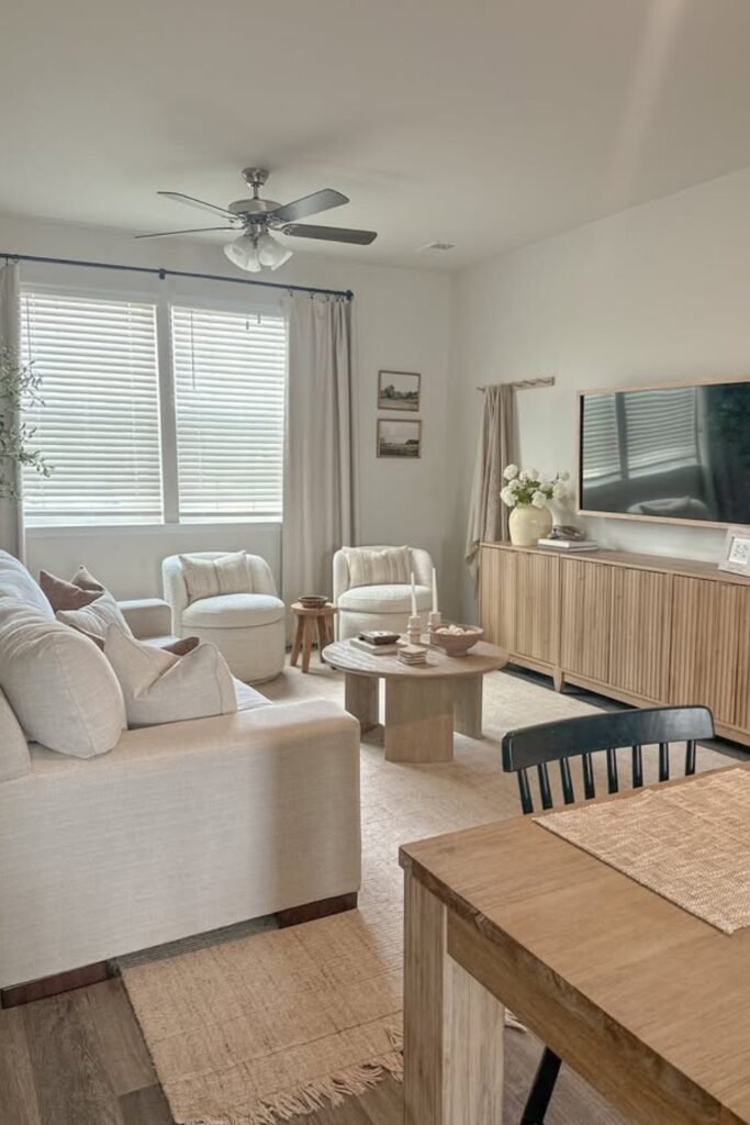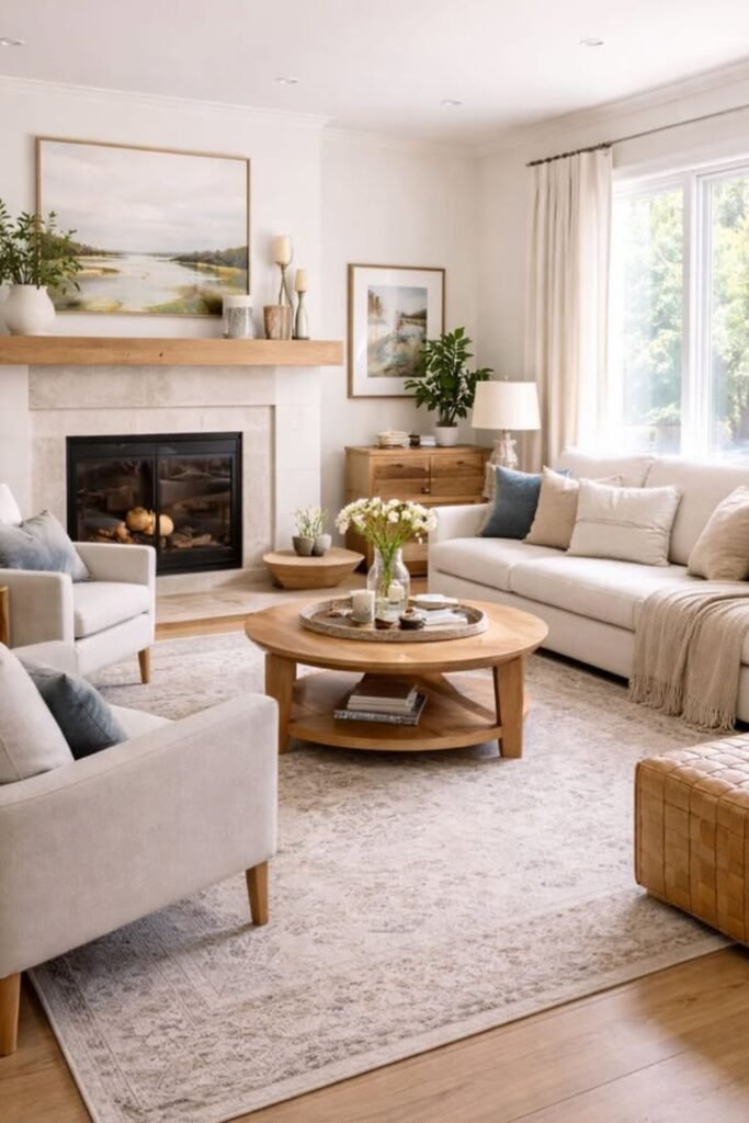 You might add a round coffee table to soften sharp angles and improve movement. You’ll see that light fabrics and a large rug underneath make everything feel cohesive and spacious.