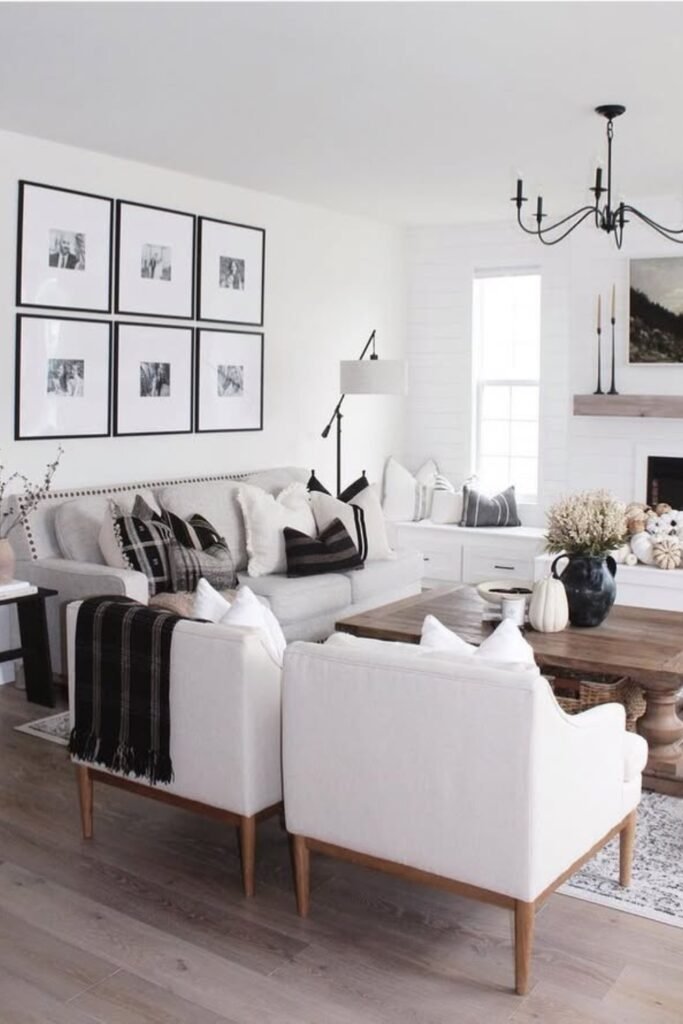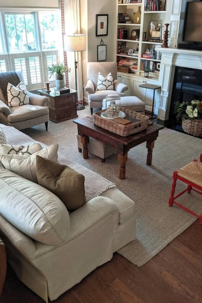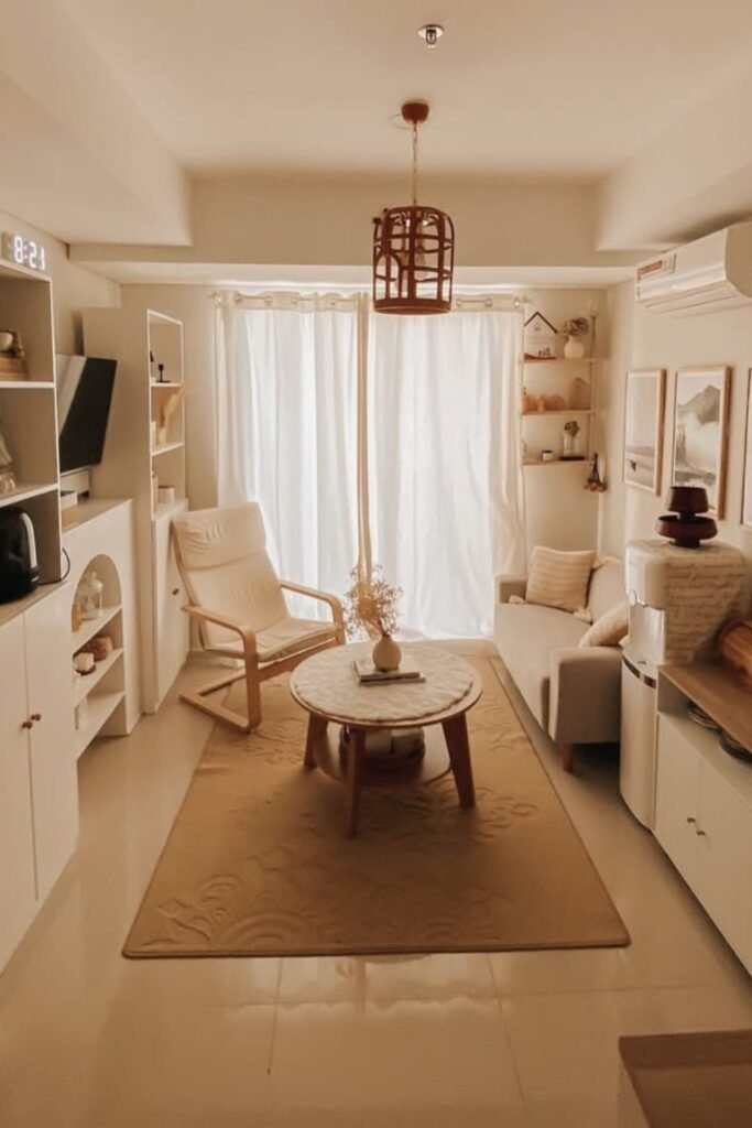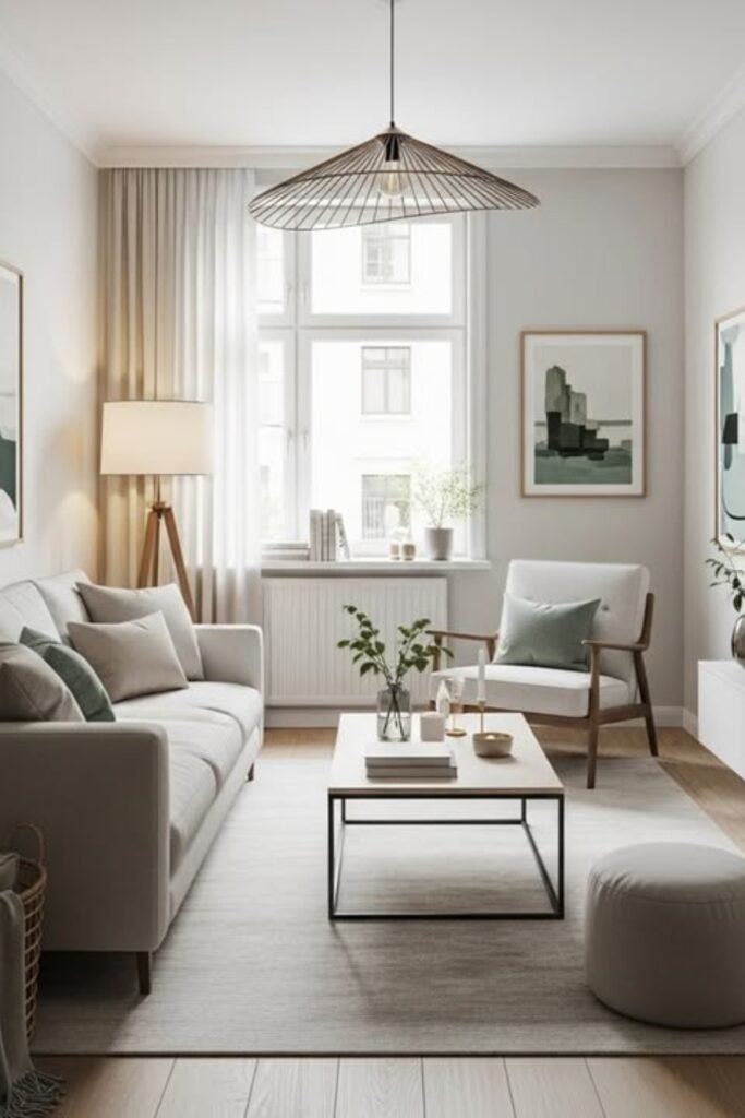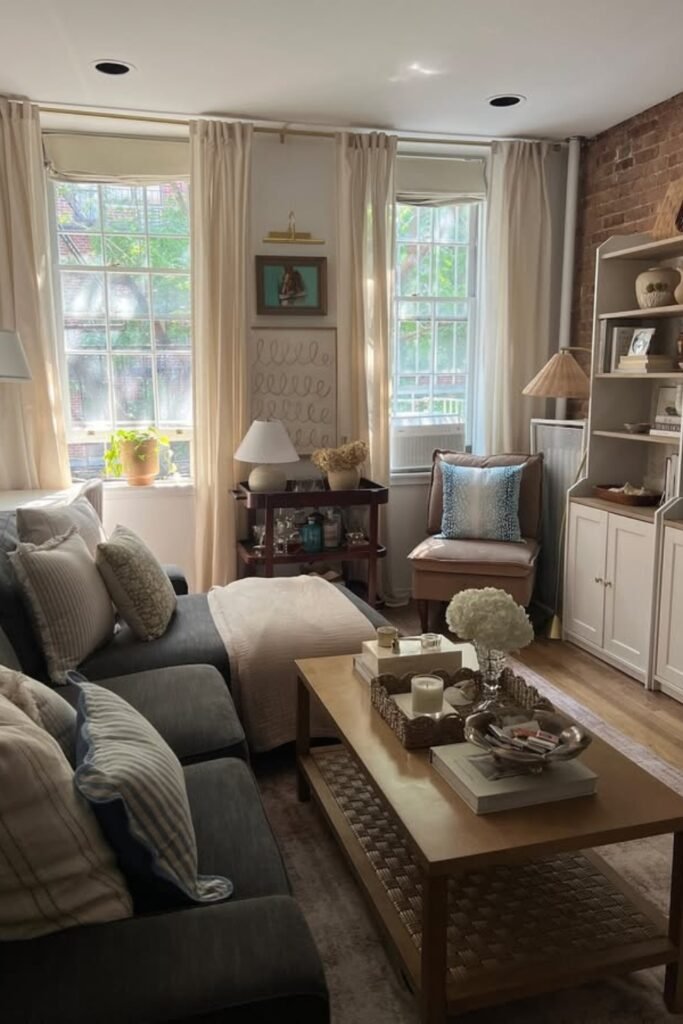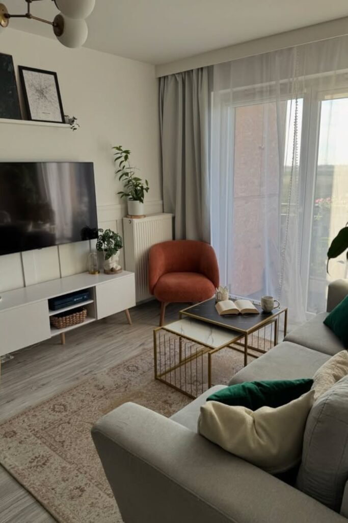 You might use a lightweight coffee table with open legs so the center doesn’t feel heavy. You’ll see that adding one accent chair near the window gives balance.