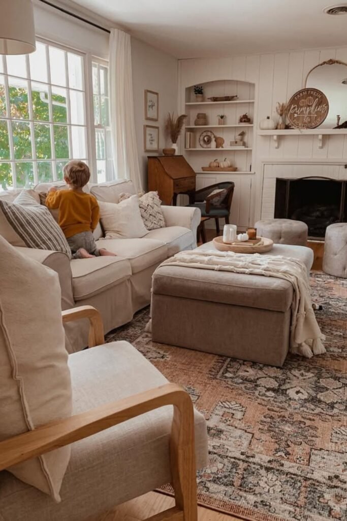 You’ll notice that a soft rug under everything pulls it together. Ideal if you want your small family living room to prioritize lounging over formality.