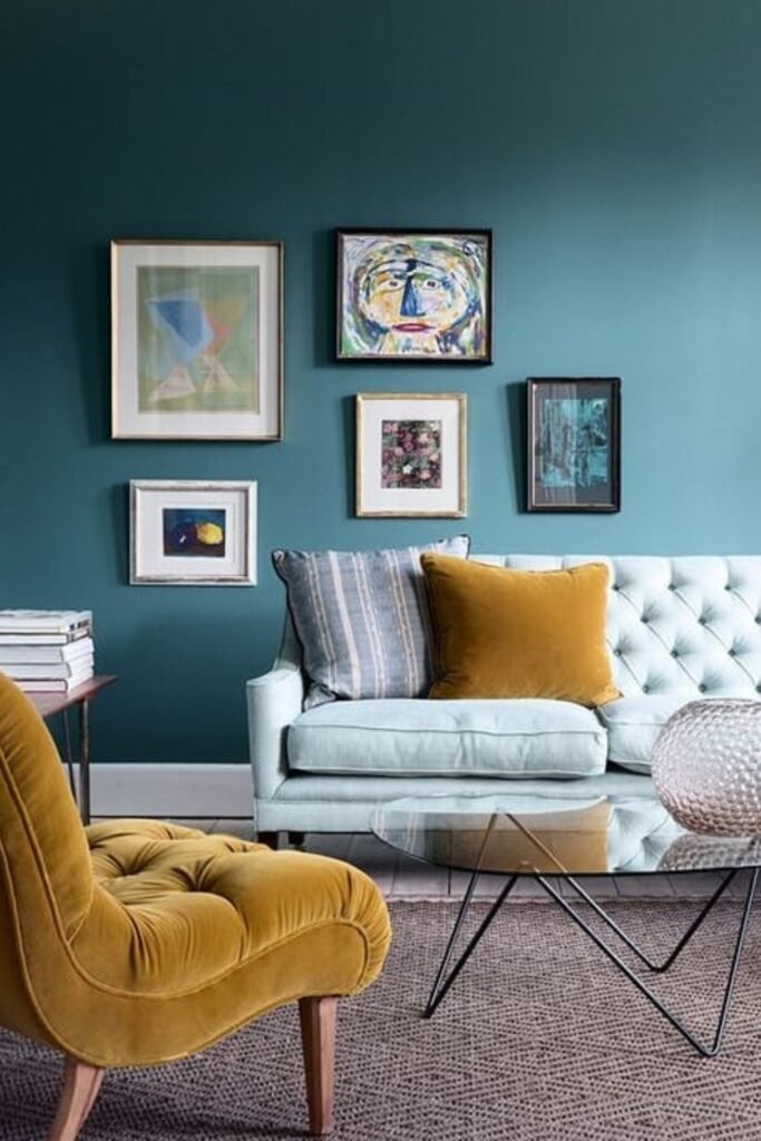 Color can do what square footage can’t. You can keep your sofa against one wall and turn that wall into a statement with bold paint and layered art.