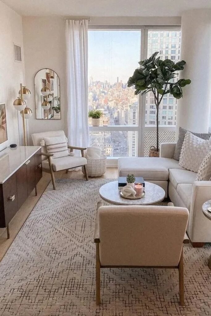 You’ll see that a large rug anchors everything and keeps your layout tight, perfect for your small city living room.